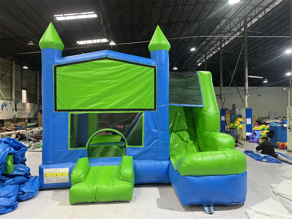 이 고전적인 성형의 튀는 집과 슬라이드는 다재다능하고 고성능의 추가로 파티 임대 재고, 가족 뒷마당,빈 캔버스 프론트 패널과 두드러진 파란색 녹색 색상, 그것은 당신의 브랜드, 테마, 또는 이벤트 요구에 맞게 끝없는 사용자 정의 가능성을 제공합니다.